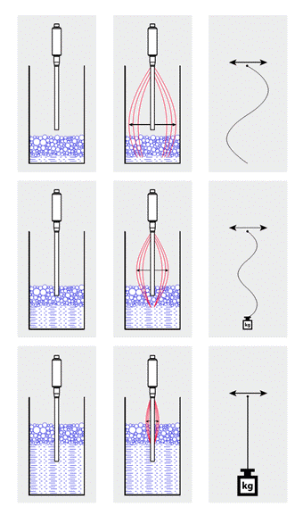 b) 當(dāng)NSL浸入泡沫但未在介質(zhì)中時(shí)(如圖4中1幅所示),二次測(cè)量原理會(huì)測(cè)量到較低的振幅(如2幅所示),此時(shí)的振幅相對(duì)而言還是比完全浸入介質(zhì)時(shí)高,所以忽略此時(shí)的液位數(shù)據(jù)。還是以擺繩模型來說明,此時(shí)在甩動(dòng)端增加一個(gè)重量,這時(shí)繩子的位移(振幅)(具體見3幅所示)會(huì)比空氣中時(shí)變小。圖3. 測(cè)量原理:當(dāng)NSL處在空氣中時(shí)